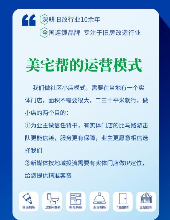 旧房翻新不是“一锤子买卖”,而是需要长期服务的民生刚需。美宅帮要做的,不是让你单打独斗,而是成为你背后的“品牌引擎”--从获客到供应链,从培训到运营,全方位为你兜底。