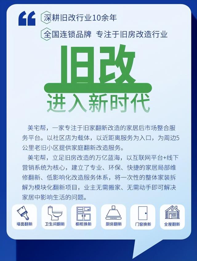在这场行业转型的浪潮中,有人犹豫观望,有人已率先布局。美宅帮,作为专注旧房翻新的系统化服务商,正以“品牌+赋能”的模式,吸引全国超30城创业者加入,用标准化、全链路的解决方案,为加盟商铺就一条“轻投入、高回报”的创业路径。